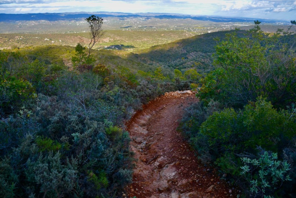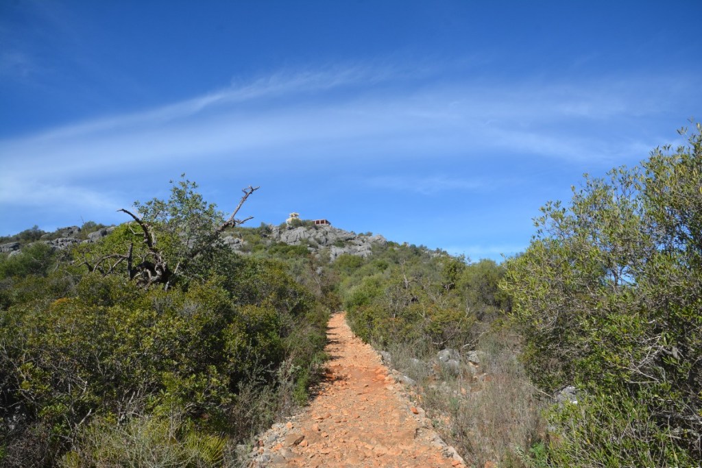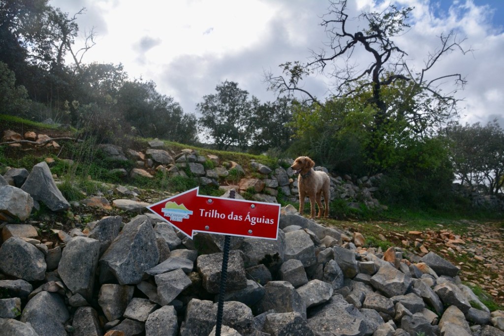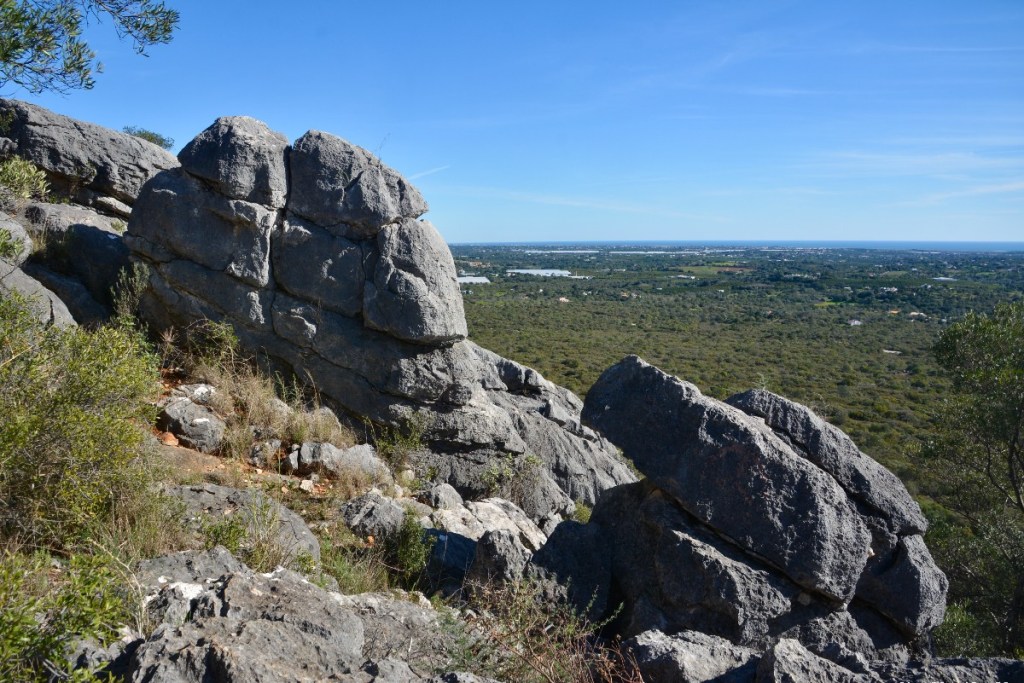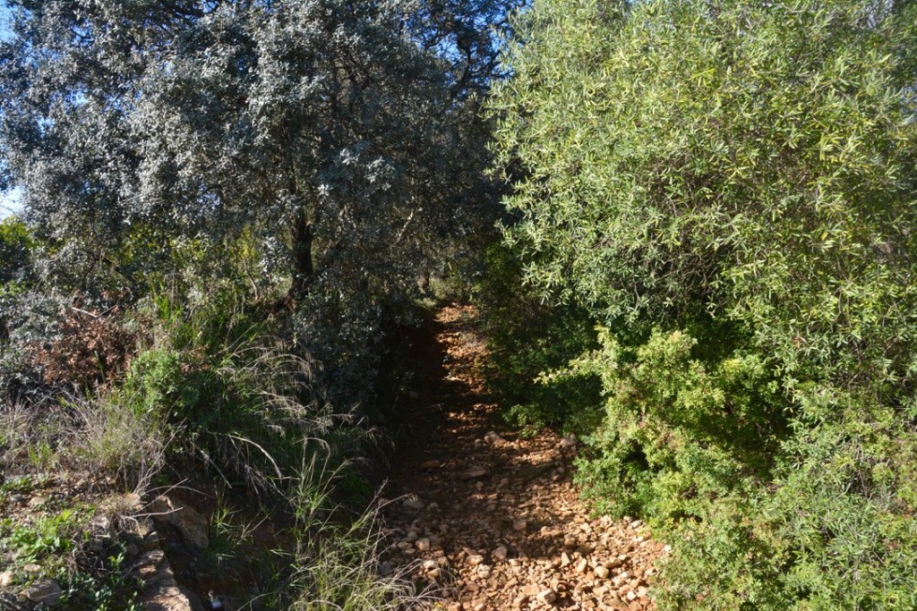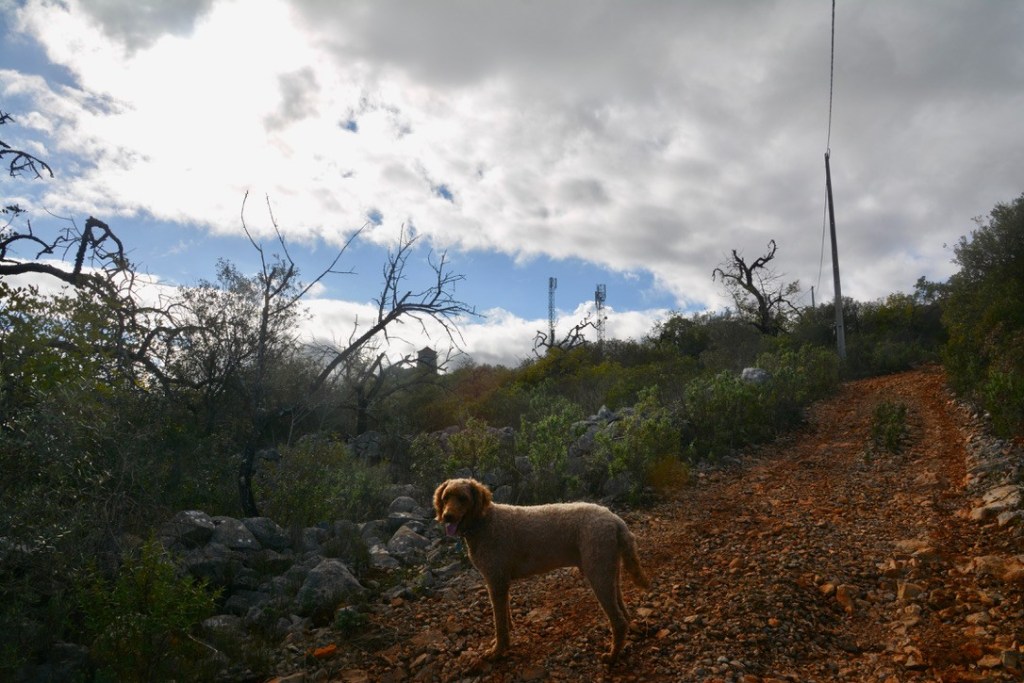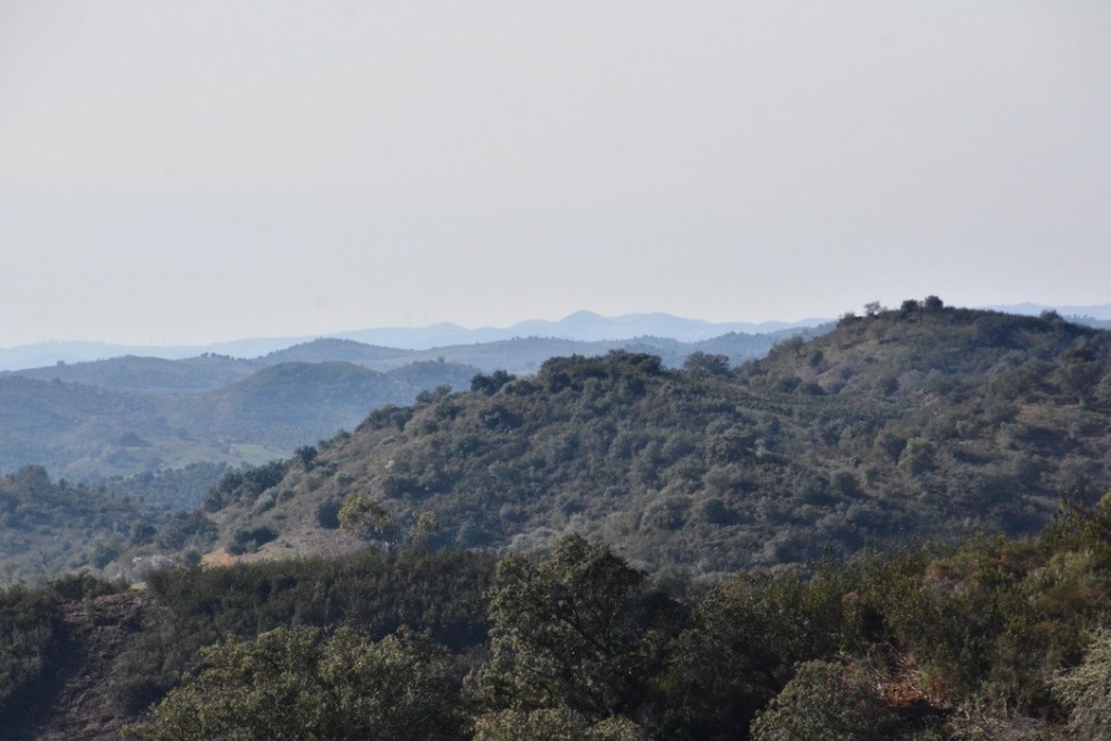 Nok om det. Min turvenn og jeg starter oppover den merkede stien som tok oss ned til Moncarapacho ved forrige forsøk. Denne gang følger vi merkingen videre østover som er skiltet med Cerro da Cabeça, Miradouro. Skjønt enige om at dette vil lede oss til toppen. Første del er steinet og ulendt gjennom en trolsk alveskog før vi havner på en grusvei rett østover. Hyggelig nok gjennom kulturlandskapet, men den leder slett ikke mot toppen. Så vi lurer litt på denne skiltingen med Miradouro og 2,3 km. Vi går og går uten å komme et skritt nærmere toppen. Derimot kommer vi etter hvert frem til en asfaltert bilvei, M1332. Der dreier løypeanvisningen endelig i riktig retning, og vi kommer til det som visstnok er startpunktet for å gå opp til utkikkspunktet. Vi kunne altså kjørt hit, men da hadde vi ikke fått med oss alvestien.