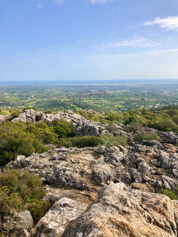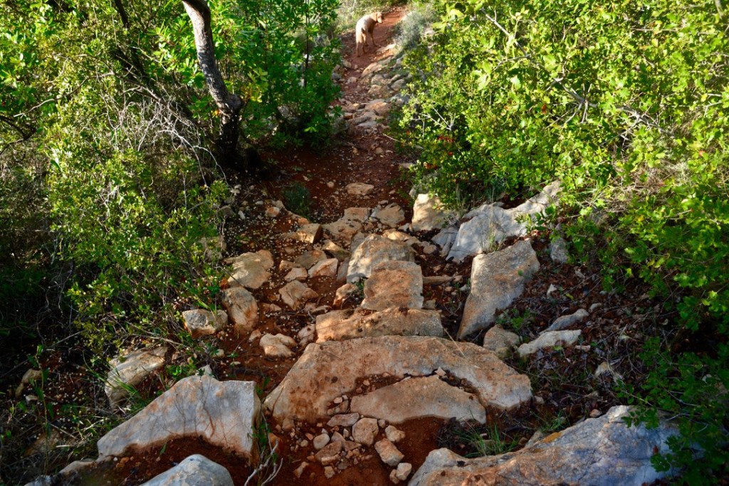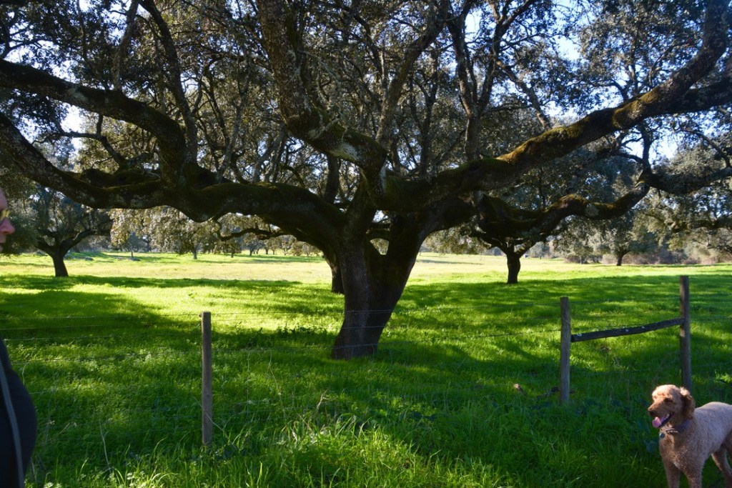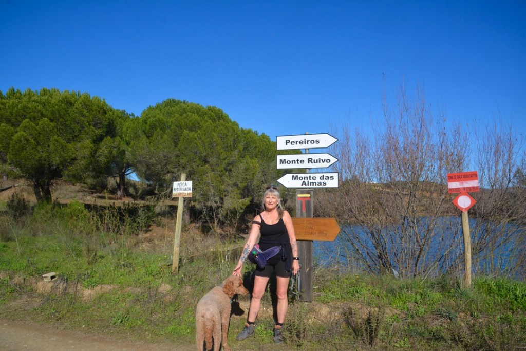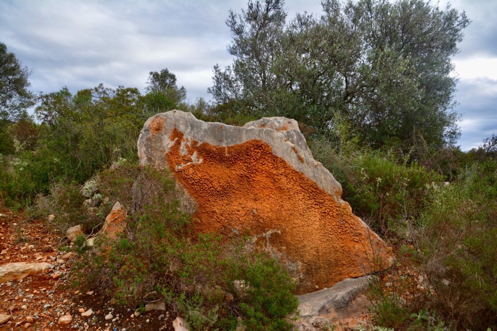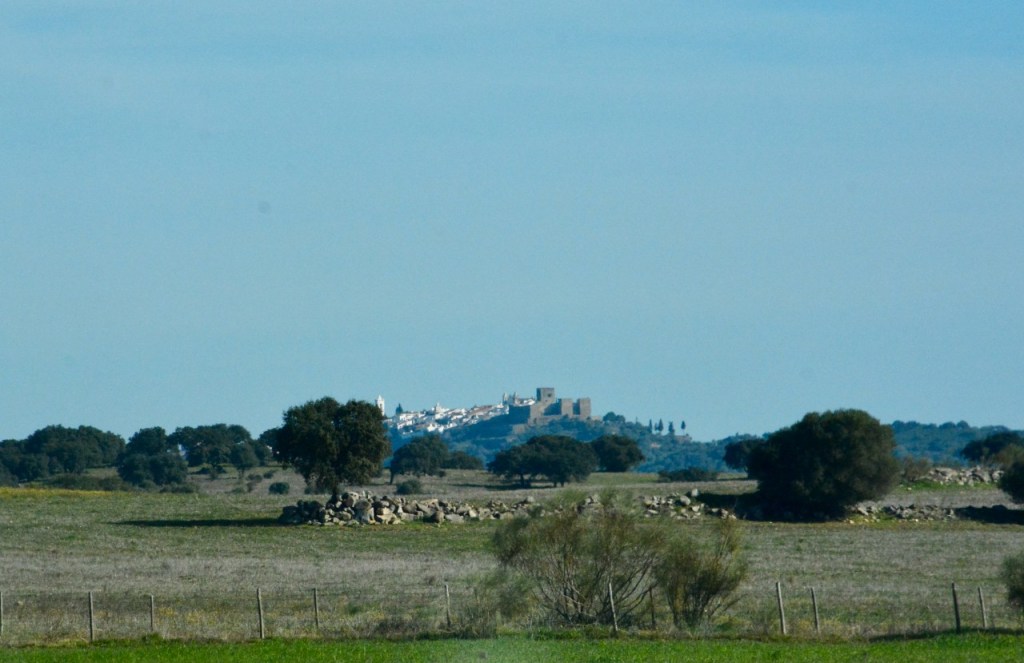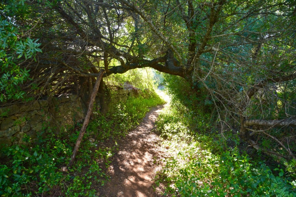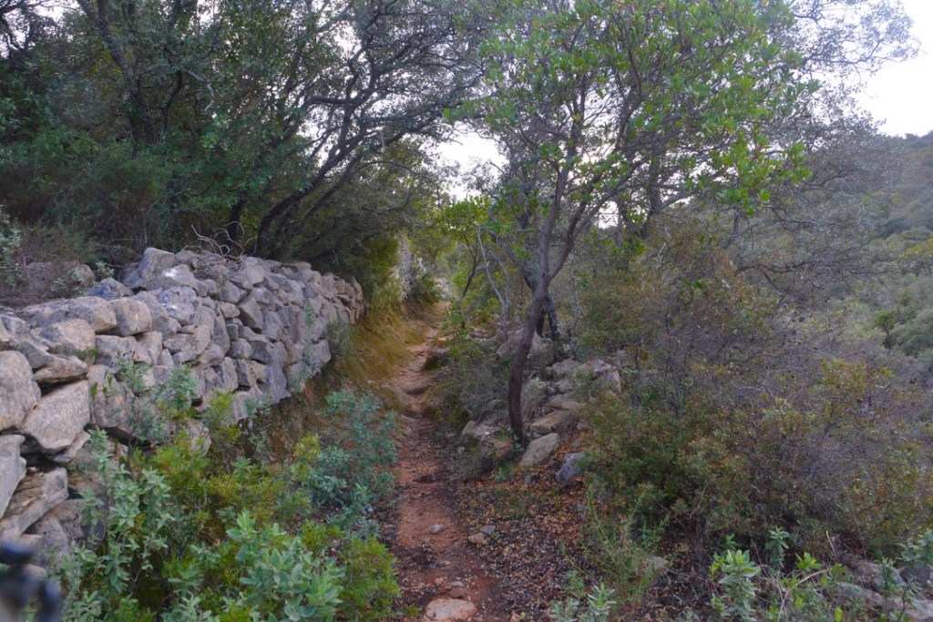 Nok om det. Min turvenn og jeg starter oppover den merkede stien som tok oss ned til Moncarapacho ved forrige forsøk. Denne gang følger vi merkingen videre østover som er skiltet med Cerro da Cabeça, Miradouro. Skjønt enige om at dette vil lede oss til toppen. Første del er steinet og ulendt gjennom en trolsk alveskog før vi havner på en grusvei rett østover. Hyggelig nok gjennom kulturlandskapet, men den leder slett ikke mot toppen. Så vi lurer litt på denne skiltingen med Miradouro og 2,3 km. Vi går og går uten å komme et skritt nærmere toppen. Derimot kommer vi etter hvert frem til en asfaltert bilvei, M1332. Der dreier løypeanvisningen endelig i riktig retning, og vi kommer til det som visstnok er startpunktet for å gå opp til utkikkspunktet. Vi kunne altså kjørt hit, men da hadde vi ikke fått med oss alvestien.