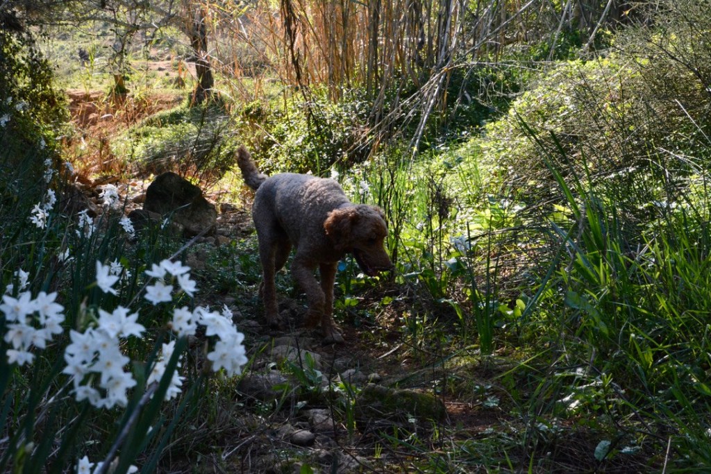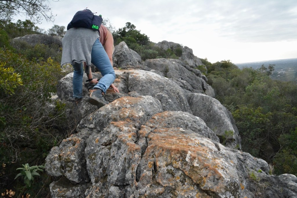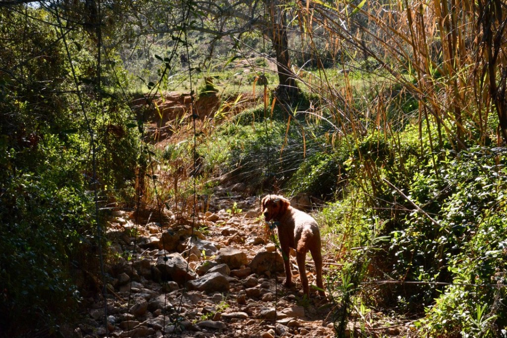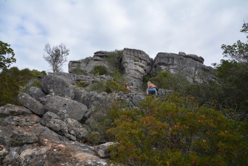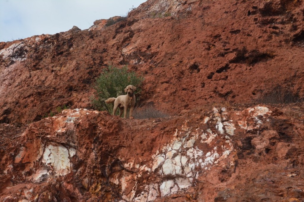Det blir en herlig tur. Vestsiden av åsen er intenst terrakottafarget. Vårens grønne vekster tyter opp og komplementærfargene virker gjensidig fremhevende. Så ekstra grønt og så ekstra rødt. Mange glade turvandrere har nok gått den før oss og lykkeligvis lagt opp små steinvarder her og der som angir retningen. Godt er det, uten disse små anvisningene kunne det blitt vanskelig å finne veien. Det blir brattere og mer steinet jo høyere vi kommer. Man må faktisk klatre med både armer og bein over flere partier. «Oh no’ene» er tilbake sammen med ytringen «This is it! This is as far as we go!». Ikke vi, nei. Han, kanskje, jeg SKAL til toppen nå. Men vil selvfølgelig ikke dra med min venn på dette, så han får det generøse tilbudet å sitte og vente på meg, mens jeg kommer meg til toppen. Men sannelig følger han etter, dog med ovennevnte utbrudd gjentatte ganger. Ludo er tydeligvis enig med min venn og synes ikke noe om at jeg bedriver denne klatringen. Han vet jo hvor dårlig balanse jeg har og bjeffer og styrer for å få meg vekk fra denne galskapen. Men også han følger trofast med. Ikke bare følger med, Ludo går faktisk først og finner den kronglete veien. Lett for ham som alltid går på alle fire.