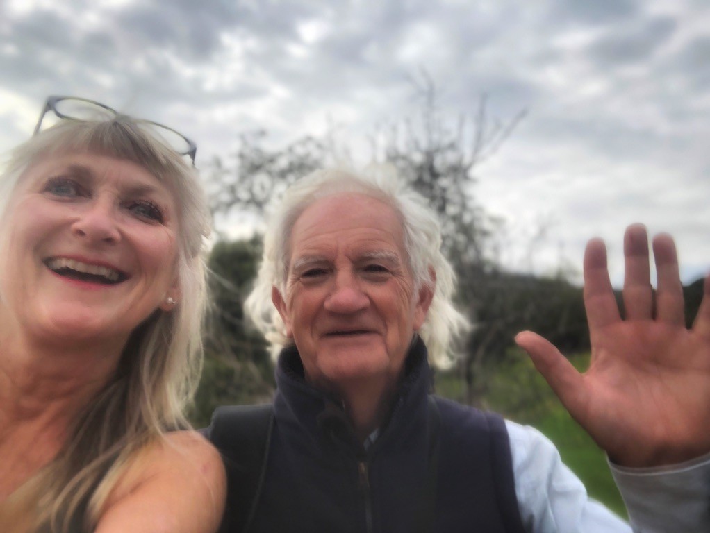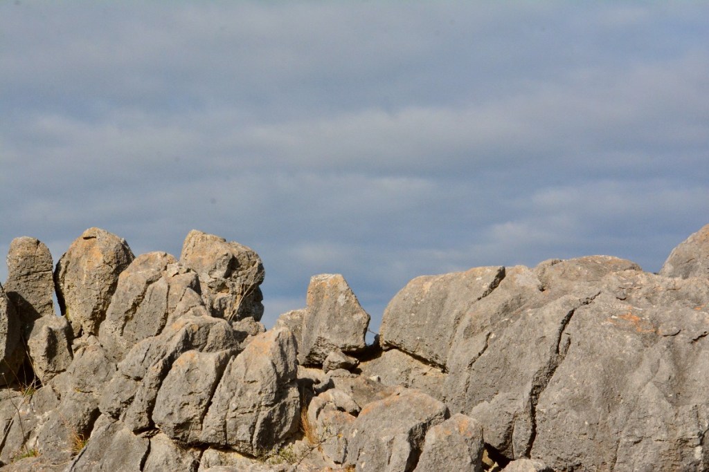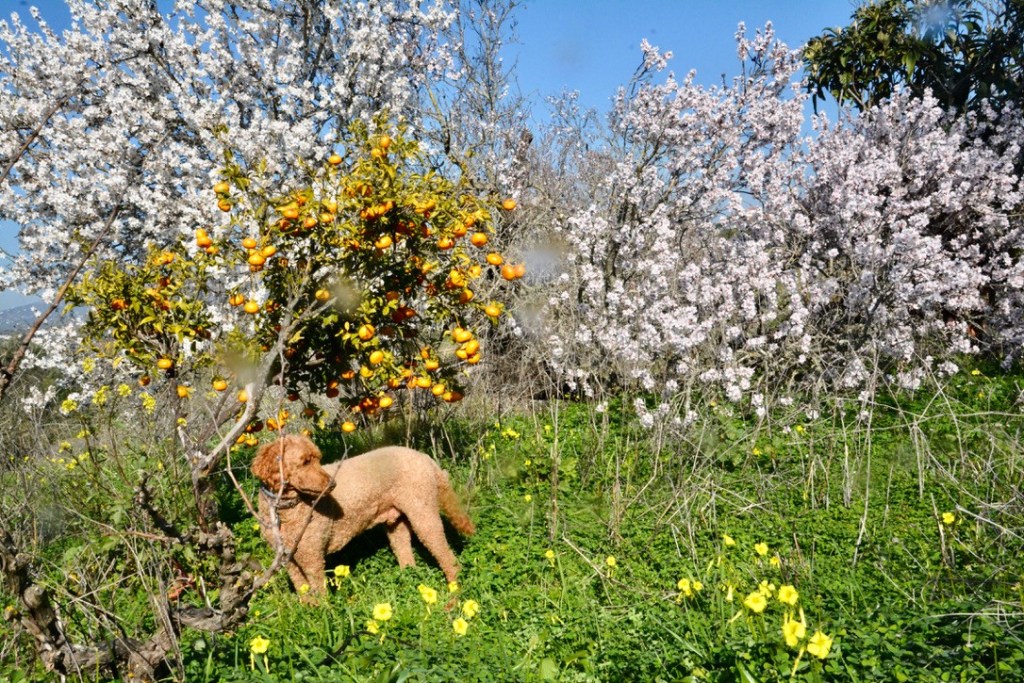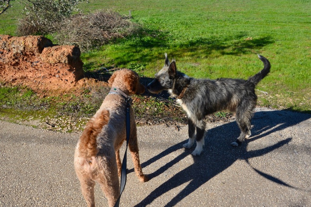 Det blir en herlig tur. Vestsiden av åsen er intenst terrakottafarget. Vårens grønne vekster tyter opp og komplementærfargene virker gjensidig fremhevende. Så ekstra grønt og så ekstra rødt. Mange glade turvandrere har nok gått den før oss og lykkeligvis lagt opp små steinvarder her og der som angir retningen. Godt er det, uten disse små anvisningene kunne det blitt vanskelig å finne veien. Det blir brattere og mer steinet jo høyere vi kommer. Man må faktisk klatre med både armer og bein over flere partier. «Oh no’ene» er tilbake sammen med ytringen «This is it! This is as far as we go!». Ikke vi, nei. Han, kanskje, jeg SKAL til toppen nå. Men vil selvfølgelig ikke dra med min venn på dette, så han får det generøse tilbudet å sitte og vente på meg, mens jeg kommer meg til toppen. Men sannelig følger han etter, dog med ovennevnte utbrudd gjentatte ganger. Ludo er tydeligvis enig med min venn og synes ikke noe om at jeg bedriver denne klatringen. Han vet jo hvor dårlig balanse jeg har og bjeffer og styrer for å få meg vekk fra denne galskapen. Men også han følger trofast med. Ikke bare følger med, Ludo går faktisk først og finner den kronglete veien. Lett for ham som alltid går på alle fire.