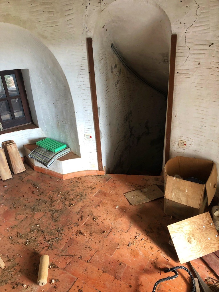 Høyt der oppe ser vi et underlig byggverk. Det ser mistenkelig bratt ut oppover, men vi vandrer med friskt mot og et par kjappe inhalasjoner av astmaspray. Skulle du sett! Det er søren meg trappetrinn oppover! Støpte, virkelige trappetrinn hele veien opp den bratte ura! Riktignok med alt for høye opptrinn og litt slitne og løse i kantene, men dog. Det krever noen pustepauser, men så når vi faktisk utkikkspunktet. En liten betongkonstruksjon på to etasjer og tydelige revner i fundamenteringen. Med Ludo i bånd drister jeg meg opp den første trappen og får en fabelaktig utsikt mot øst, sør og nord. Samt en like fabelaktig høydeskrekk. «Rekkverket» er ca. femti centimeter. Og min kjære Ludo elsker å hoppe. Gjerne over kanter hvor han ikke aner hva som er på den andre siden. Hunder kan som kjent ikke lese høyder slik vi kan. Ikke tale om at jeg går opp den neste smale trappen uten rekkverk som fører opp til øverste plan. Her er sikringen en betongkant på ca. tjue centimeter.