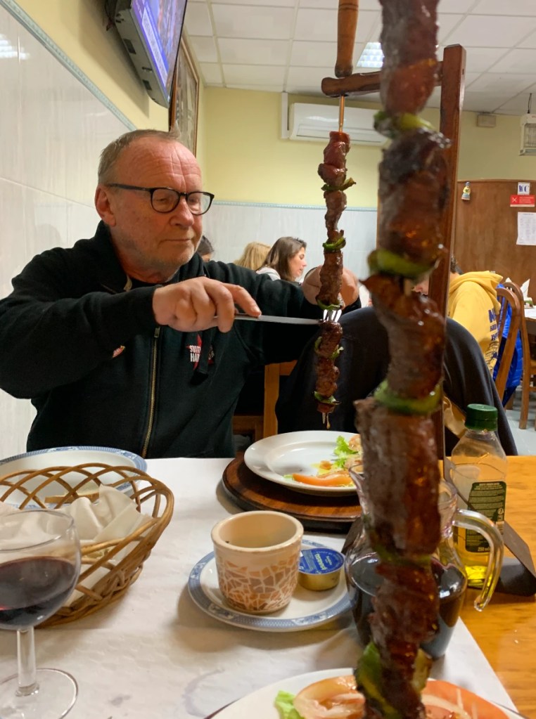Vi er mange som elsker å synge. Lykkeligvis er våre instrumenterende, engelske venner, Ken, Cath og Sandie på plass. Det blir en glad og morsom aften med sing-a-longs på camprestauranten og felles lunsj i byen dagen derpå. Ny restaurant med vidunderlig sjømat og den beste hvitvinen jeg har smakt her.