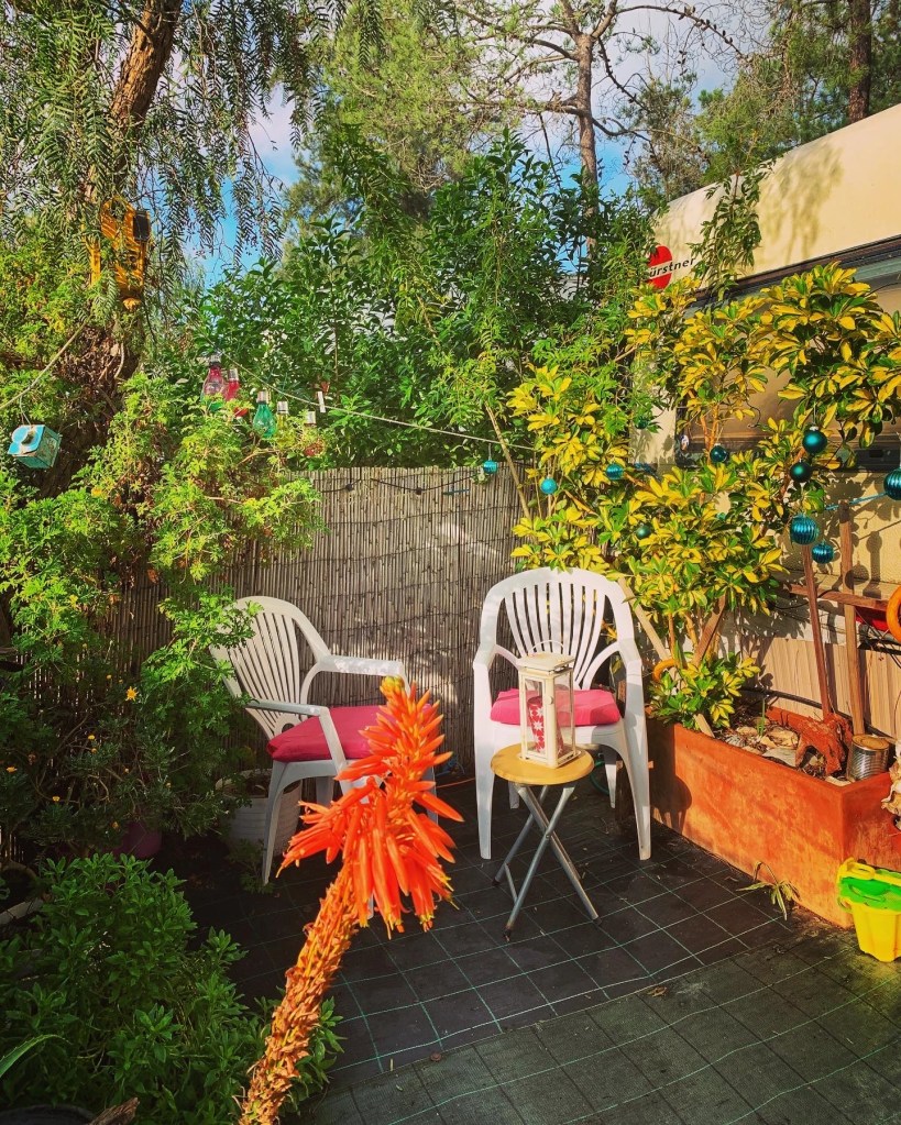 Dagene går med til å rydde opp på pitch’en vår og i gazebo’en. Pitch’en er en jungel takket være vår enestående nabo Janet som har vannet her i åtte måneder! Jeg som trodde at det meste av plantene mine kom til å ha gått heden. Isteden har de vokst slik at jeg må ta i bruk sag på de største. Alle urtene, gressløk, persille, chili, løpstikke, mynte, søt basilikum – alle lever i beste velgående. Hvilken fryd!