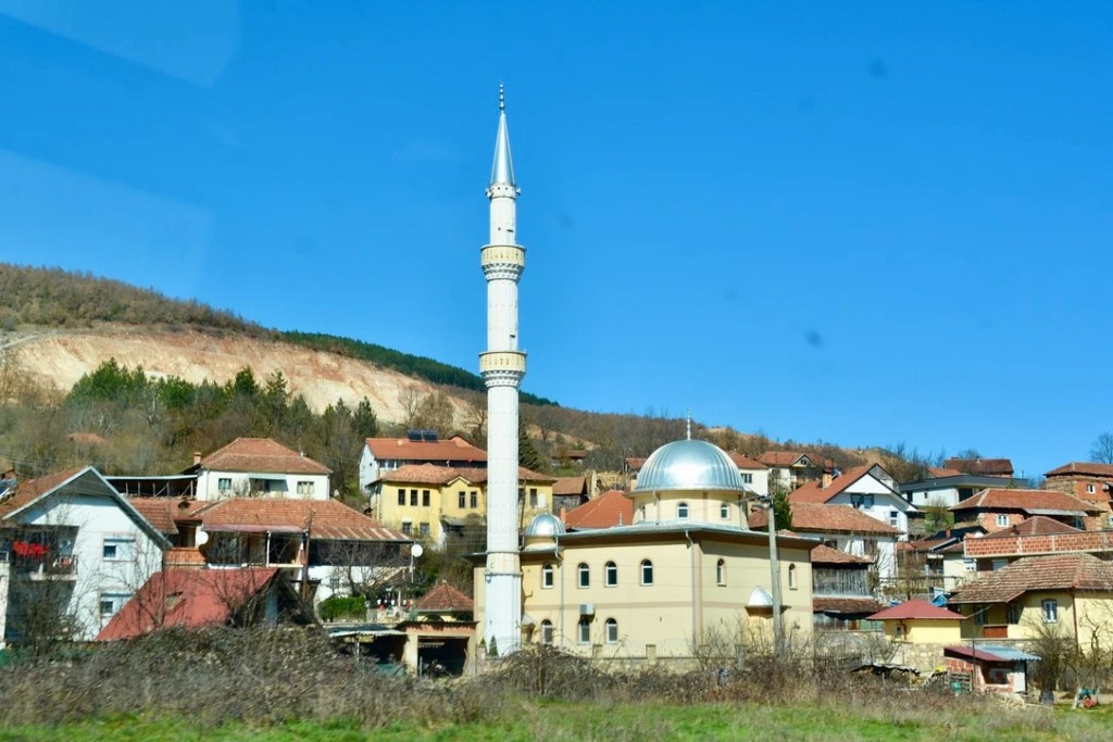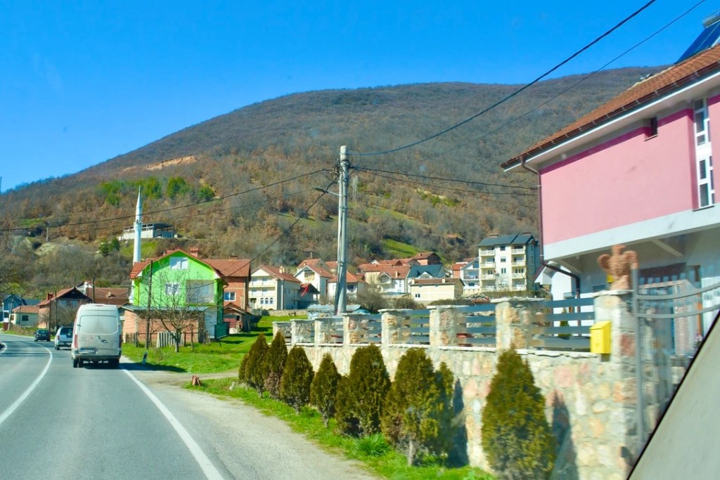 Vi kjører gjennom et stort område hvor det albanske flagget vaier fra hver eneste flaggstang. Her er tett i tett med de karakteristiske moskéene. Alle bygget etter samme arkitektoniske prinsipp. En rektangulær bygning med en del av taket formet som en rund kuppel og så minareten som rager høyt til værs. Selve bygget kan ha like gilde farger som bolighusene, mens minareten alltid er kritthvit. Litt mer påkostede moskéer kan ha større grunnbygning med flere kupler og gjerne to minareter.