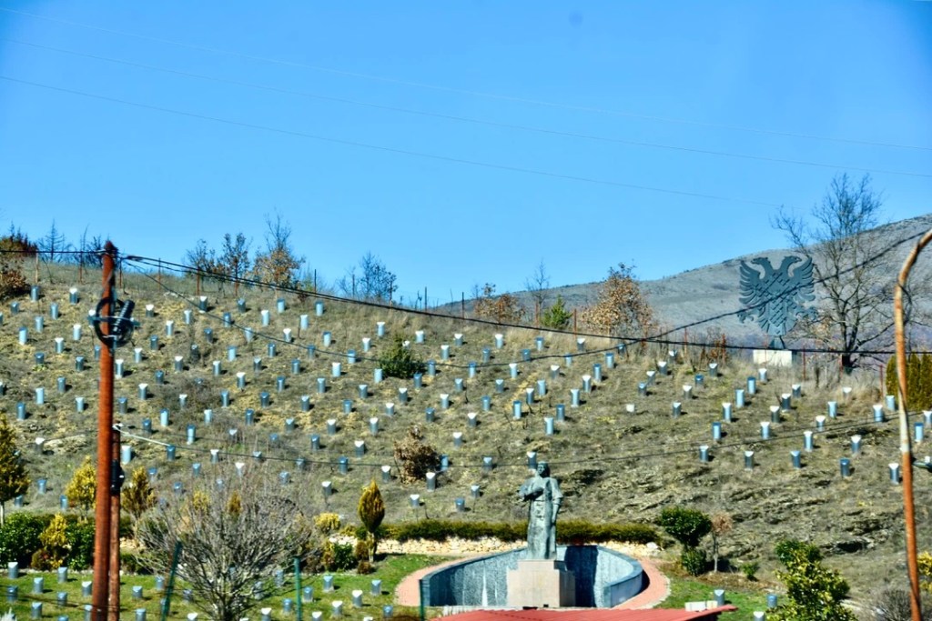 Ved byen Zajas passerer vi det gripende komplekset «Mother Albania». På et tretusen kvadratmeterstort område står en rekke lave metallsøyler og blinker i solen. Dette til minne om alle albanske menn som ble drept i den første Balkankrigen, 1912- 1913. Den førte til det Ottomanske rikets fall og fremveksten av serbisk, senere jugoslavisk herredømme over området.