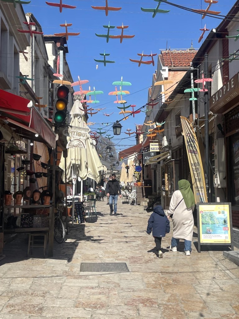 Skopjes symbol, den gamle stenbroen over Vardar, forbinder den muslimske delen med Gammelbasaren og den nye delen med prangende bygg og statuer. Førstnevnte side er varm og koselig som i en typisk arabisk Souk. Mengder av små butikker med brukt og nytt av alt en kan tenke seg. Tett i tett med små, utendørs serveringssteder. Med et helt vidunderlig utvalg av alkoholfri drikke basert på alt en kan tenke seg av frisk frukt. Likeså minst tjue forskjellige varianter av kaffe- og tedrikker. Her koser vi oss Jan og jeg. Dette er det vi liker. Enkelt og folkelig.