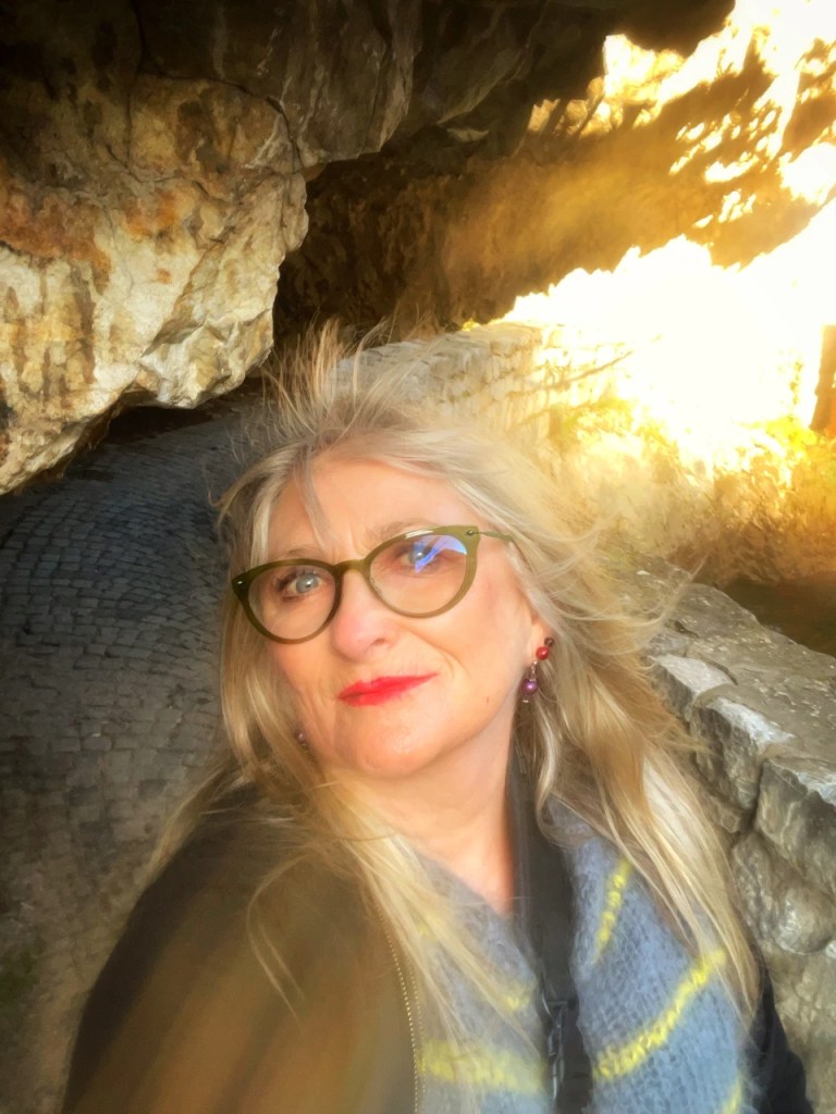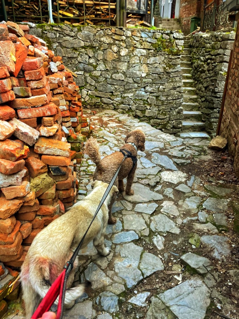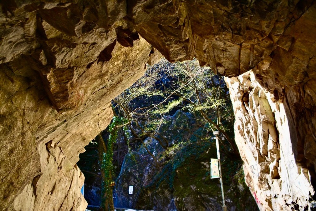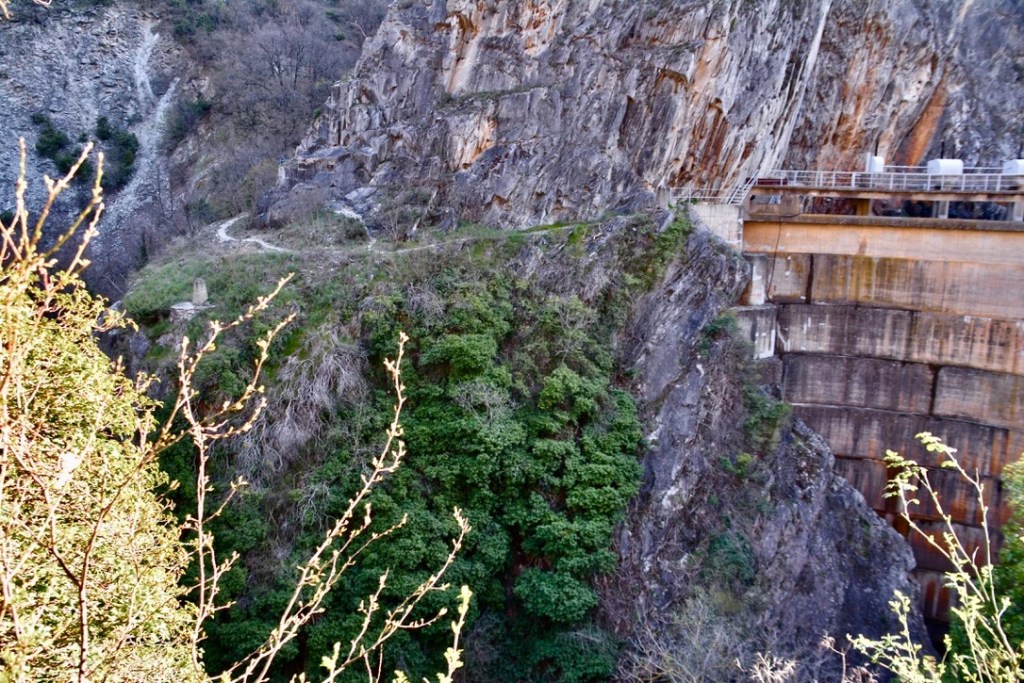 Det er isnende kaldt nå før sola har nådd frem til juvet. Høydeskrekken trigges mens jeg blåholder på Floke. Her er vidunderlig vakkert. Vel verdt å trosse både kulde og høydeskrekk for. Langs stien er det en rekke salgsboder som åpner senere på dagen. Etterhvert kommer jeg frem til et bitte lite hotell som kun kan nås til fots. Her er også båtutleie som kan ta en med videre innover til en stor grotte. Floke og jeg får følge av en hvit hund som forelsker seg i oss begge. Floke tøffer seg når hunden begår den uhyrlige frekkhet å slikke hånden min. Og jeg den uhyrlige utroskap ved å klappe den. Ingen andre hunder skal berøre meg. Eller jeg dem. Der er Floke helt klar, sjalu som han er.