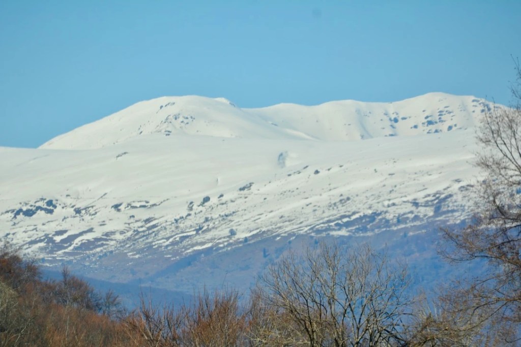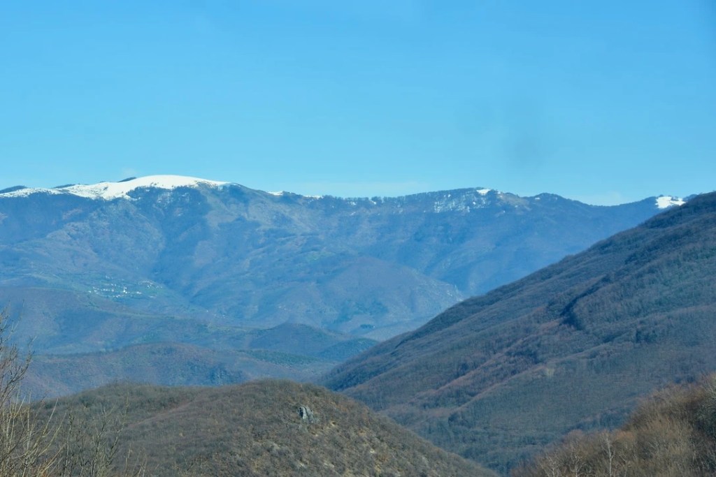 Om en skal unne dette landskapet å få vist seg frem på sitt optimale, bør man kjøre en måned senere enn hva vi gjør. Nå, før løvsprett, er fargesettingen monokrom. Fjorårets eikeløv henger fortsatt på trærne. Landskapet speiler løvets varme kanelfarge i ulike nyanser av brunt. Spektakulært er det likevel. Topografien er dramatisk med de dypeste elvedaler mellom uendelige fjelltopper. På alle kanter rager de høyeste toppene kledt i skinnende hvite vinterkåper. Noen store busker med smått konfettidryss i gult, skaper litt avveksling i det brune. Likså de gule flekkene med leirfivel (hestehov) langs veikantene og busker med dunete kattlabber (gåsunger) som så smått begynner å få et vårlig gulskjær.