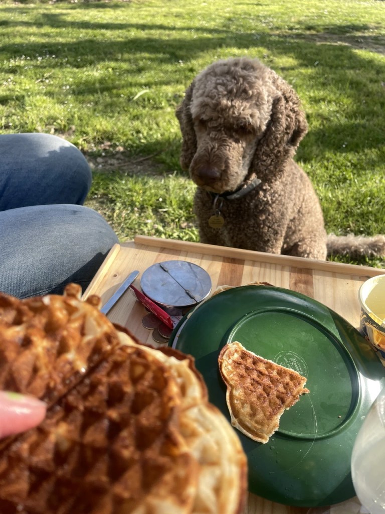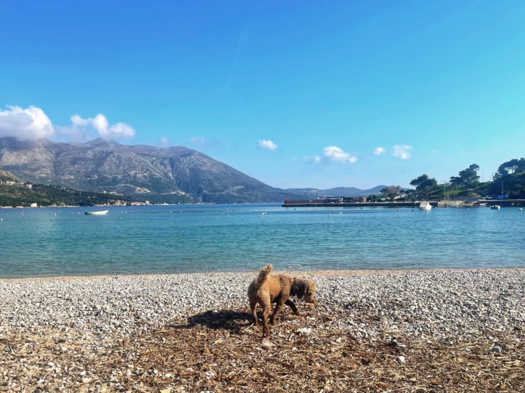Men, som dere vet. Alt «årne sæ». I Kroatia dukker det sannelig opp et skilt som fører til en «stellplass» som faktisk er åpen. Auto Camp Matkovica i Srebreno. Liten og hyggelig på gress under blomstrende kirsebærtrær. Innehaver Daniela tar hjertelig i mot oss og er overstrømmende av begeistring over Floke. Da går hun selvfølgelig rett til våre hjerter også. Her har vi alt vi kan begjære. Fred og ro, vennlighet og strøm. Kjøpesenter rett ved hvor vi får alt vi trenger. Fem minutter ned til nydelig, hvit strand og turkis Adriaterhav som blinker i sola. Floke stormer lykkelig av gårde og hiver seg rundt og leker oter før han vasser ut i havet for å avkjøle seg. Svømme kommer ikke på tale, sier han. Man å stå i sjøen med vann til oppå brystet er nydelig før han springer og ruller seg i sanda igjen. Man kan jo bare tenke seg hvordan senga vår blir, men alt for Flokebarnet som vi elsker så høyt.
