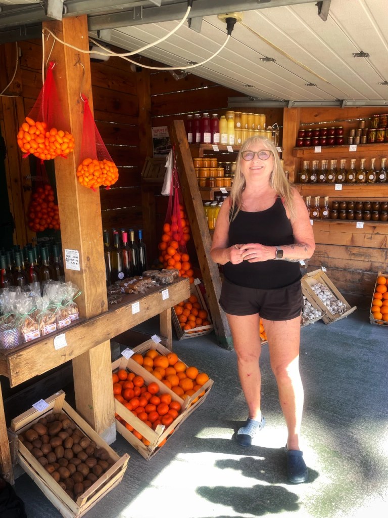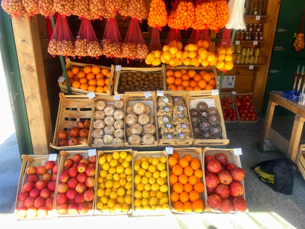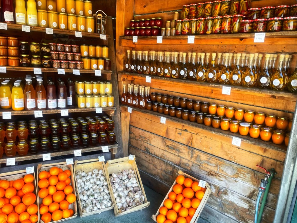 En fristende salgsbod med lokale godsaker frister oss til å stoppe og jeg går helt amok. Nyplukkede klementiner, kumquats og granatepler må jeg ha. Ferskpresset juice av klementiner og granatepler er ren lykke. Soltørkede fikener uten sulfitt og annen dritt. Akasiehonning til mat og nytelse, salviehonning til bruk ved forkjølelse. Og olivenolje. Tykk, grønn, nypresset jomfruolje. Så vidunderlig på smak at jeg kan drikke den.