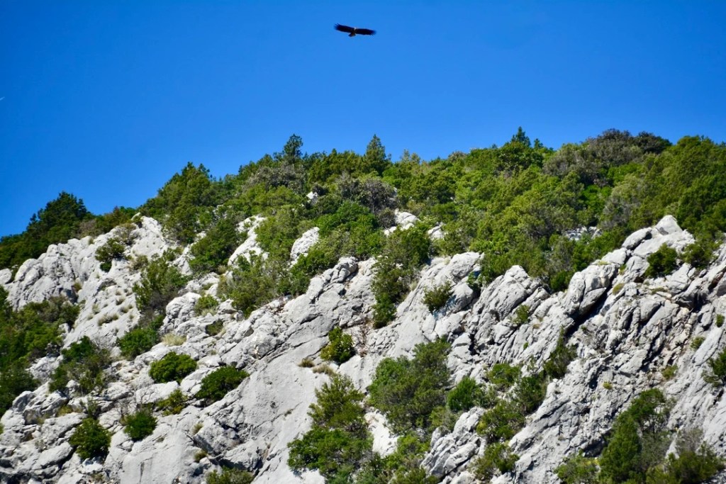 Vi får nok en spektakulær kjøretur gjennom Flokes tolvte land. Stopper og rusler litt og nyter utsikt og natur hvor gullgule busker med kjempevikke sprer sin nydelige duft. Over oss seiler en kjempestor rovfugl. Ørn eller gribb? Jeg er ikke kyndig nok til å avgjøre det.