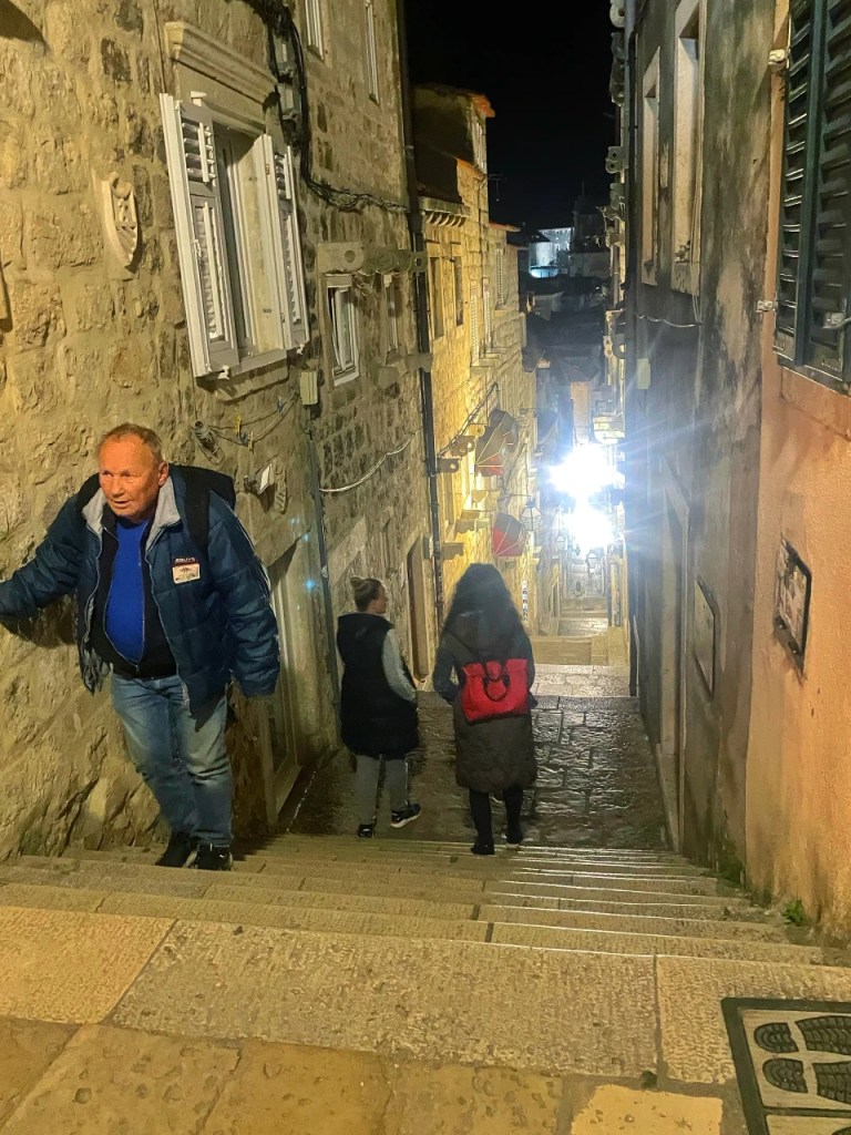 Vi nyter dagen i solen. Lar en sliten og glad Floke være hjemme alene under tilsyn fra Daniela og tar en Uber inn til gamlebyen i Dubrovnik om kvelden. Slike gamlebyer er meste stemningsfulle på kveldstid når den blå natten senker seg og lysene kommer på. Som alle vakre historiske steder, preget av turisme og med omtrent norsk prisnivå. Det er absolutt å anbefale å gjøre som oss og oppleve slike steder utenfor sesong. Nå er det riktig så fredelig her og romslig nok til at vi faktisk ser byen.