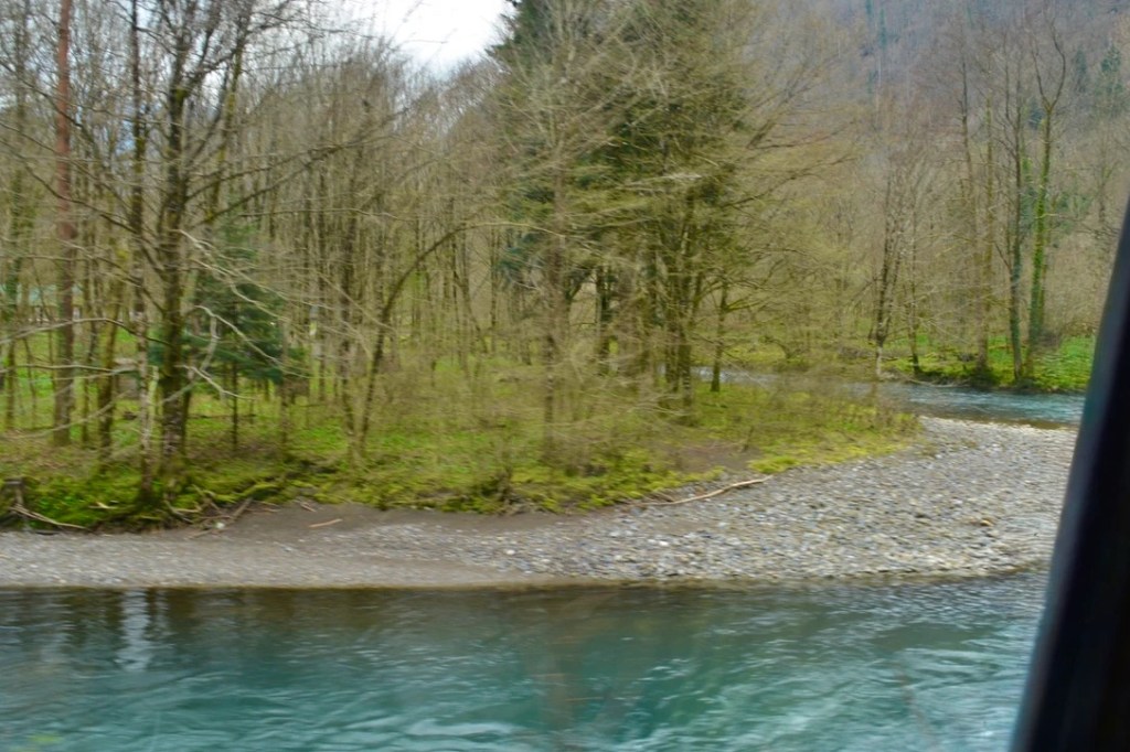 Vi er i kommunen Kostel som regnes som et uoppdaget paradis. Her satses det på økoturisme rundt den rene elva som blir så varm om sommeren. Her er grotter og fossefall og en helt nydelig natur. Vi må bare stoppe litt her og ta inn de første inntrykkene av Slovenias natur. Overalt blomstrer hvite skyer av kirsebærplomme. Vill forsythia stråler i gullgult langs veikantene. Bladløse løvtrær er kledt i grønn mose og slyngende eføy der de bøyer seg over den turkisgrønne elva.