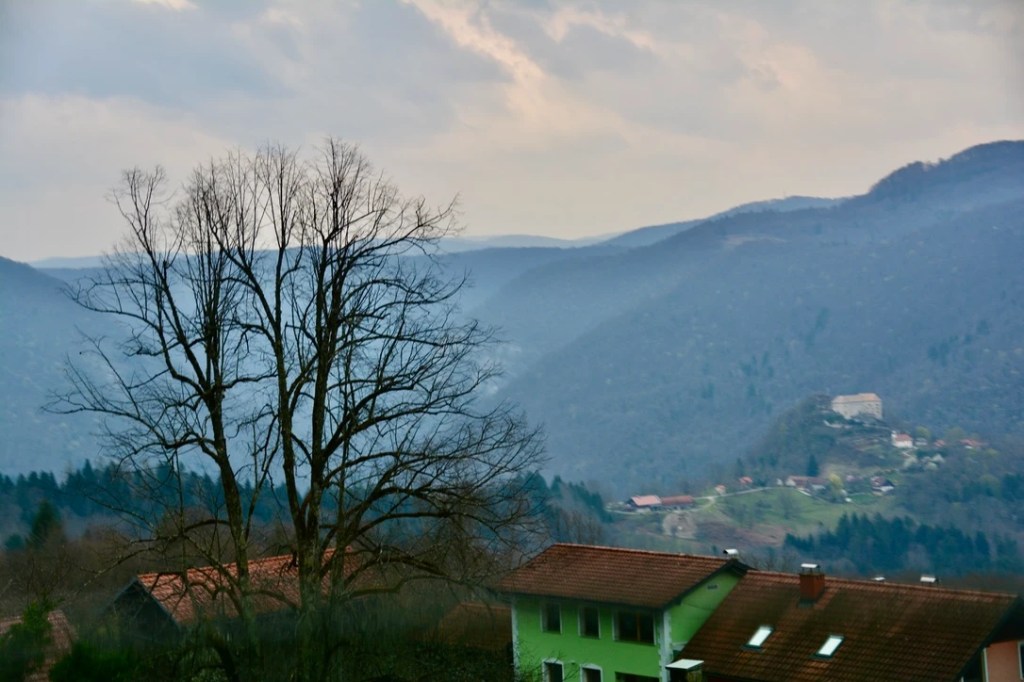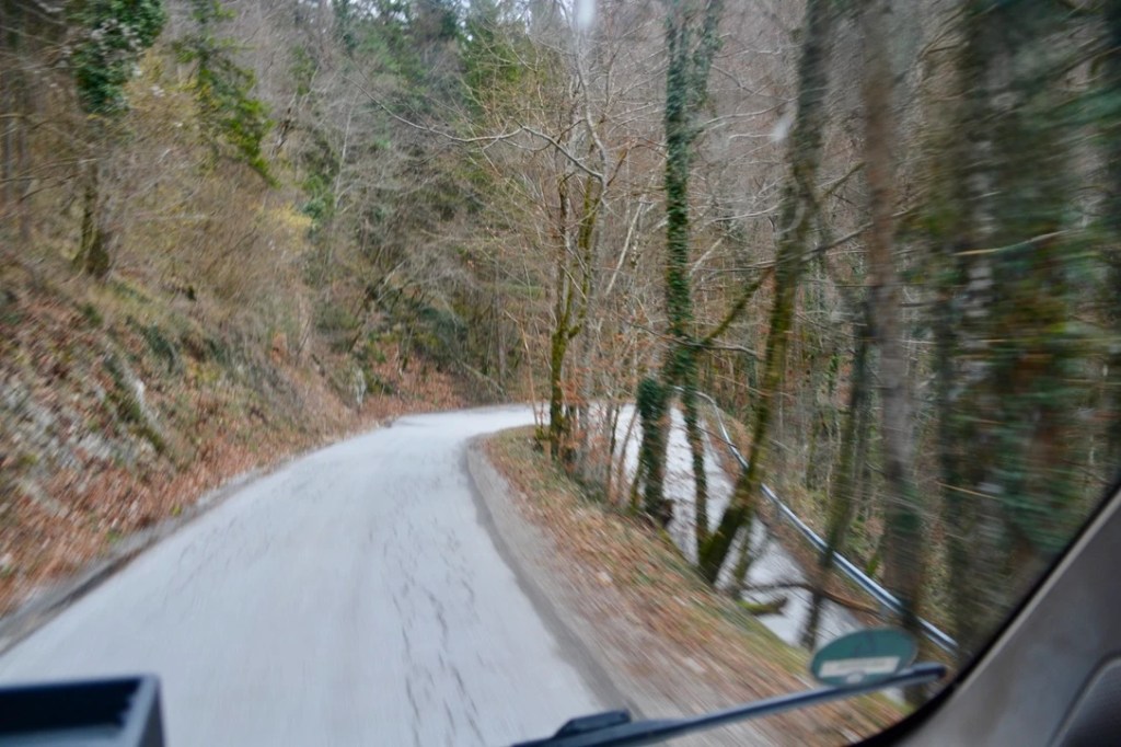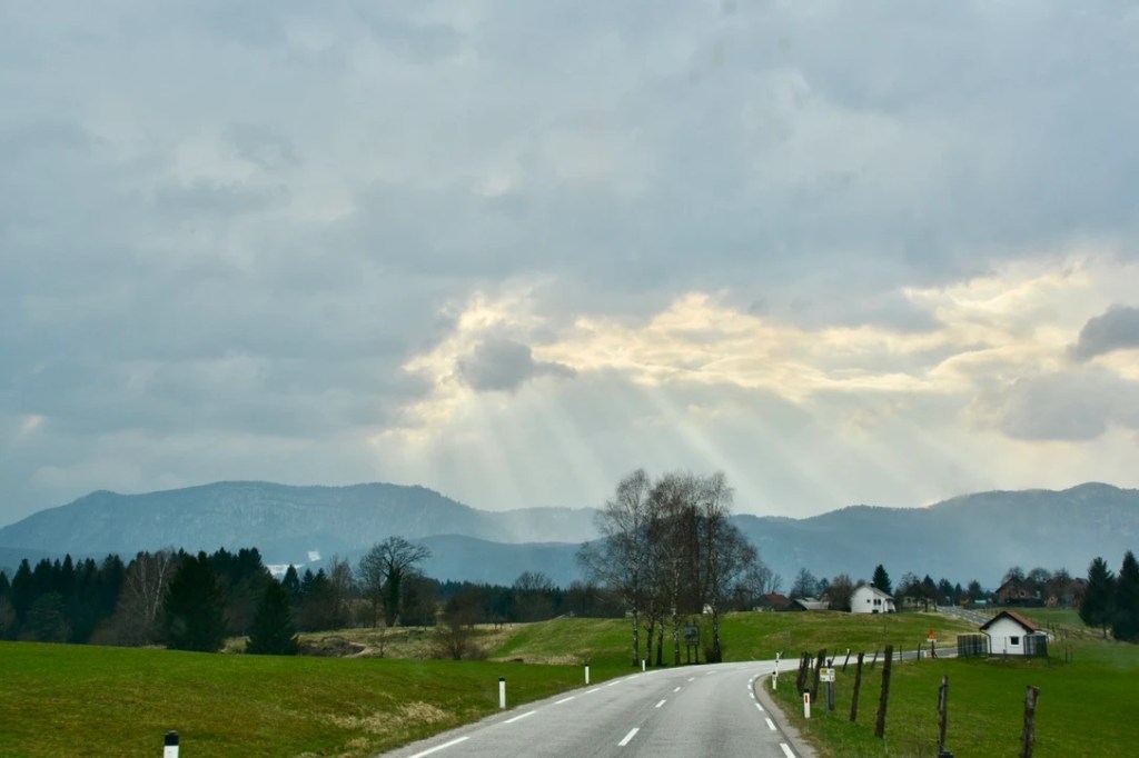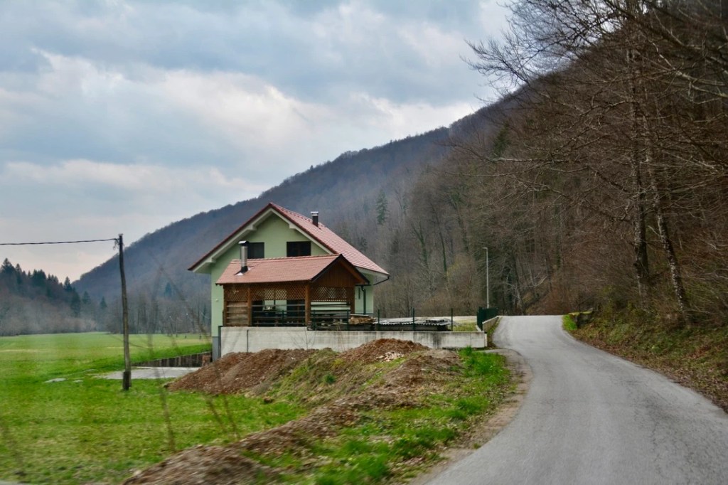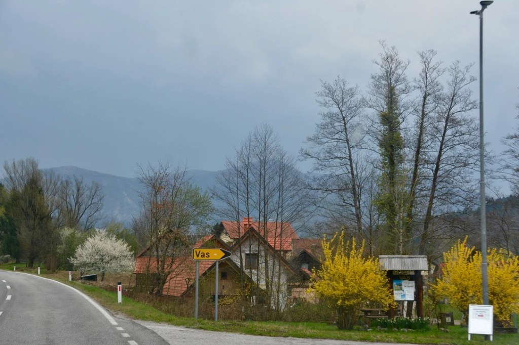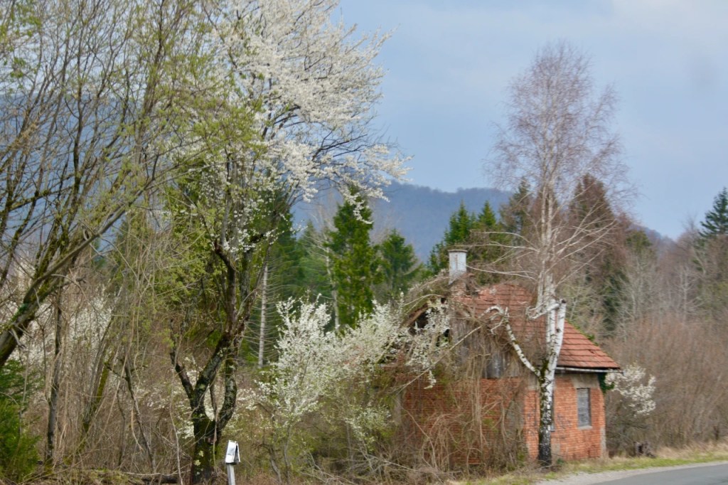Vinteren følger oss hele veien videre i langs E71. Midt mellom Bosiljevo og Osojnik tar vi vestover på E65 til Lucice. Herfra følger vi landevei 203 som slynger seg nordover mot Slovenia. Vinteren slipper taket for en stund, og et helt annet landskap åpenbarer seg. Fjellene trekker seg i bakgrunnen og slipper til bratte granskoger med hvitveis og fioler i veikantene. Hadde det ikke vært for mengden av blomstrende kusymre og klosterklokker, ville jeg nesten trodd jeg var hjemme i Haldens skoger.