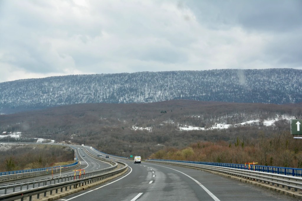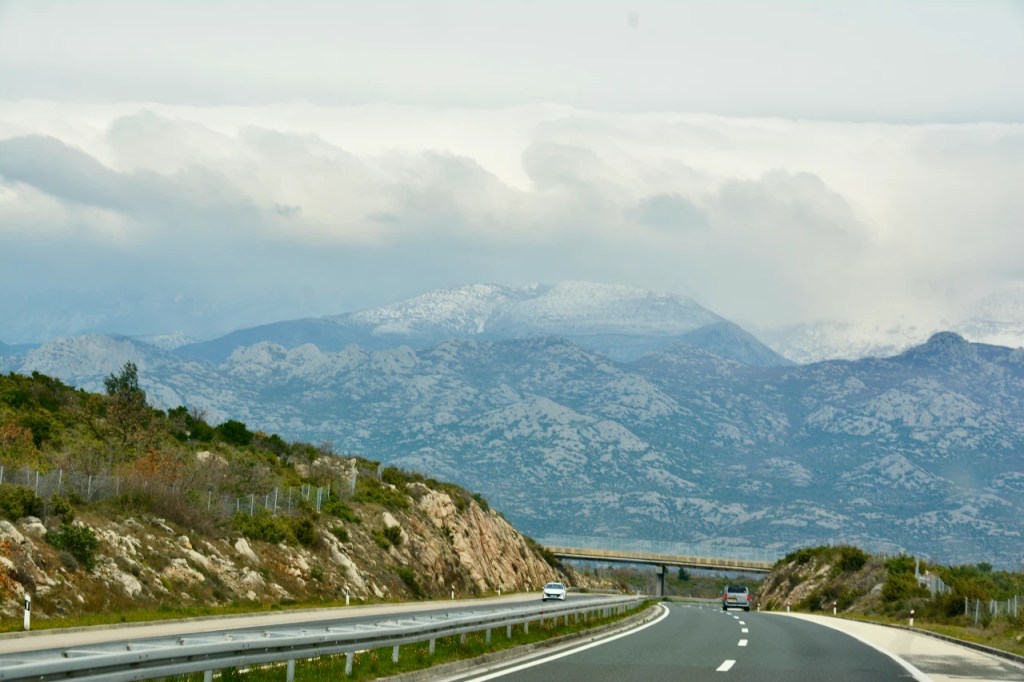 Om vi ikke reiser tilbake i tid, reiser vi i hvert fall tilbake i årstid. Vi kjører rett inn i vinteren. Snøen ligger rundt oss på alle kanter her vi kjører bratt oppover mot fjellene. I tillegg er det så sterk vind at fartsgrensen er satt til 40 km i timen på motorveien. Skummelt. Det røsker godt i KaràJan, og det er stupbratt ned på utsida av veien. Tross fabelaktig utsikt, blir jeg glad for hver eneste lange tunell vi kjører gjennom. Har en klump i magen av spenning om hvilket vær og føre som kommer til å møte oss i den andre enden. Enda godt det er oppholdsvær og bar vei.
