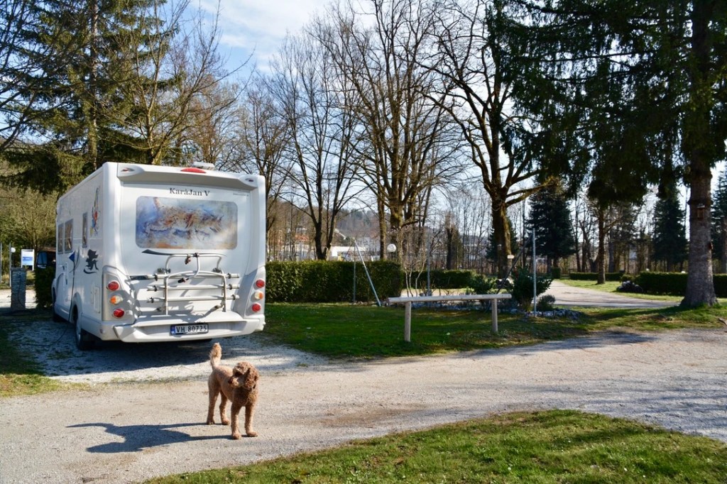 Det blir stadig mer urbant mens vi nærmer oss Ljubljana. Vi kjører strake veien gjennom byen til Ljubljana Resort Hotel og Camp. Et nydelig sted ved elven Sava som renner gjennom byen. Campingen er på en stor gresslette under store løvtrær. Fioler, kusymre, hvitveis, gulveis og andre markblomster danner store tepper. Her får Floke masse plass å springe på.