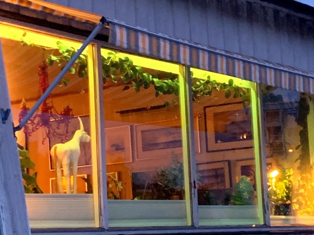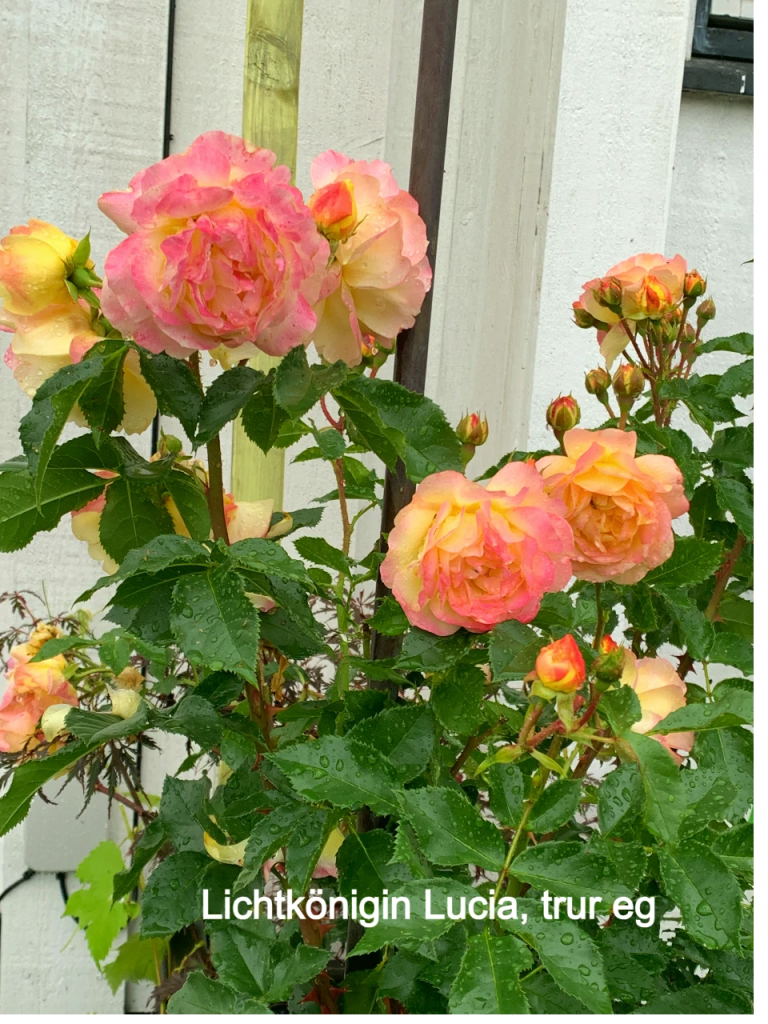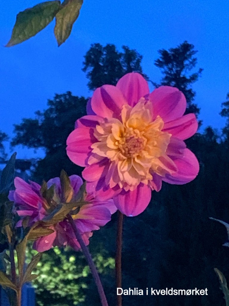 For mett til å orke dessert, går jeg ut i regnet. Alt er så vakkert og trolsk med alle regndråpene som glitrer i skumringen. Det er slett ikke kaldt, rundt sytten grader nå til kvelden. Men Ludo hæler ikke å bli med. Han liker ikke regn. Står bare under tak på terrassen og ser på mens jeg plukker våte bringebær og binder opp busker og redder blomster som regnet har slått ned. Regnet gir seg omsider og det blir kveldstur. Oss tre sammen igjen. Rummikub, brettspillet vi elsker, spilles i fire runder med Ludo som sovende deltager. Alt for sent blir det for A-mennesket. Trøtthetsgrensen er passert. og natten blir til våkenatt.