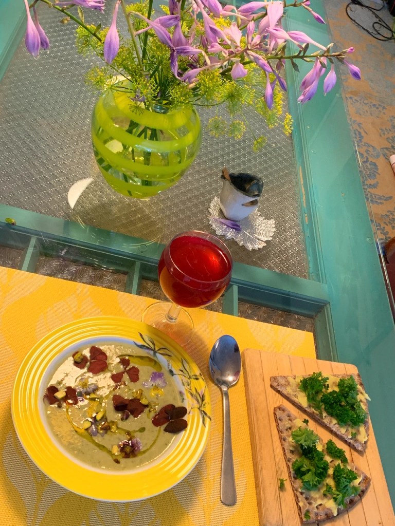 Jan er fornøyd med sin kjappe suppe, og jeg er faktisk overbegeistret for min rett. Den beste middagen jeg har spist på lenge. Laget elleve store squashkaker og spiser seks. Med nydelig chili-dip til og en yoghurtrøre med jordbærspinat. Og enda bedre blir måltidet av at Ludo ligger ved siden av meg på sengbenken og snorker. Helt inntil meg.